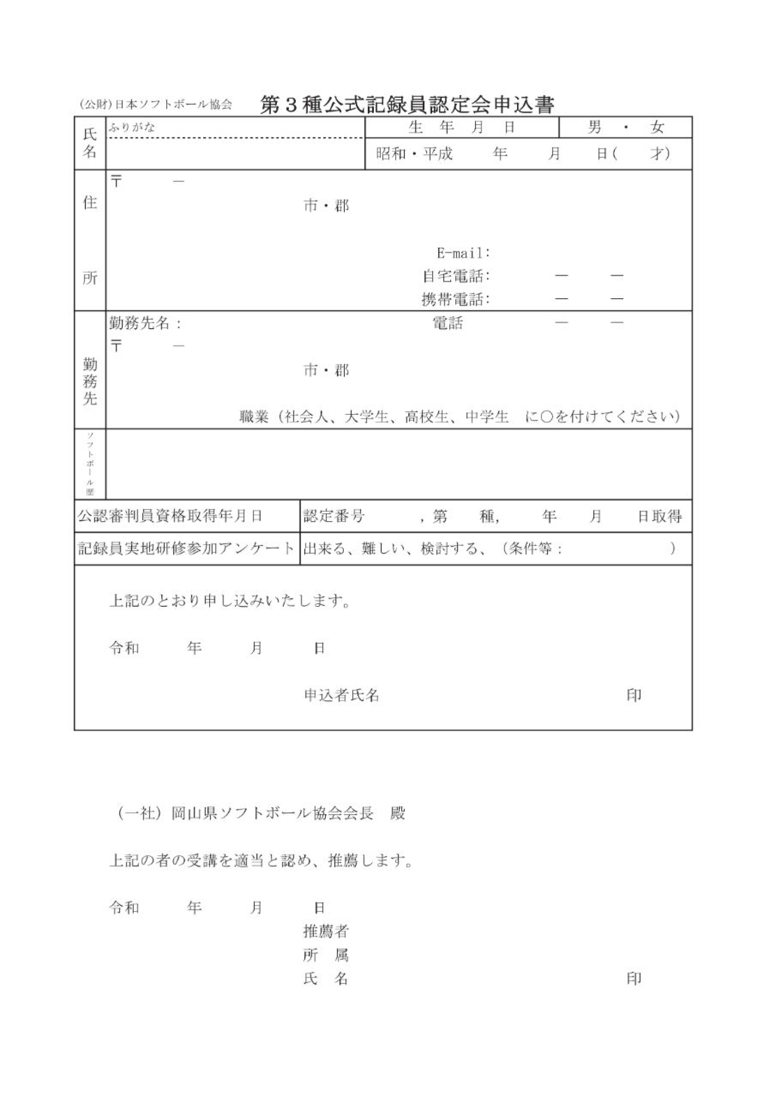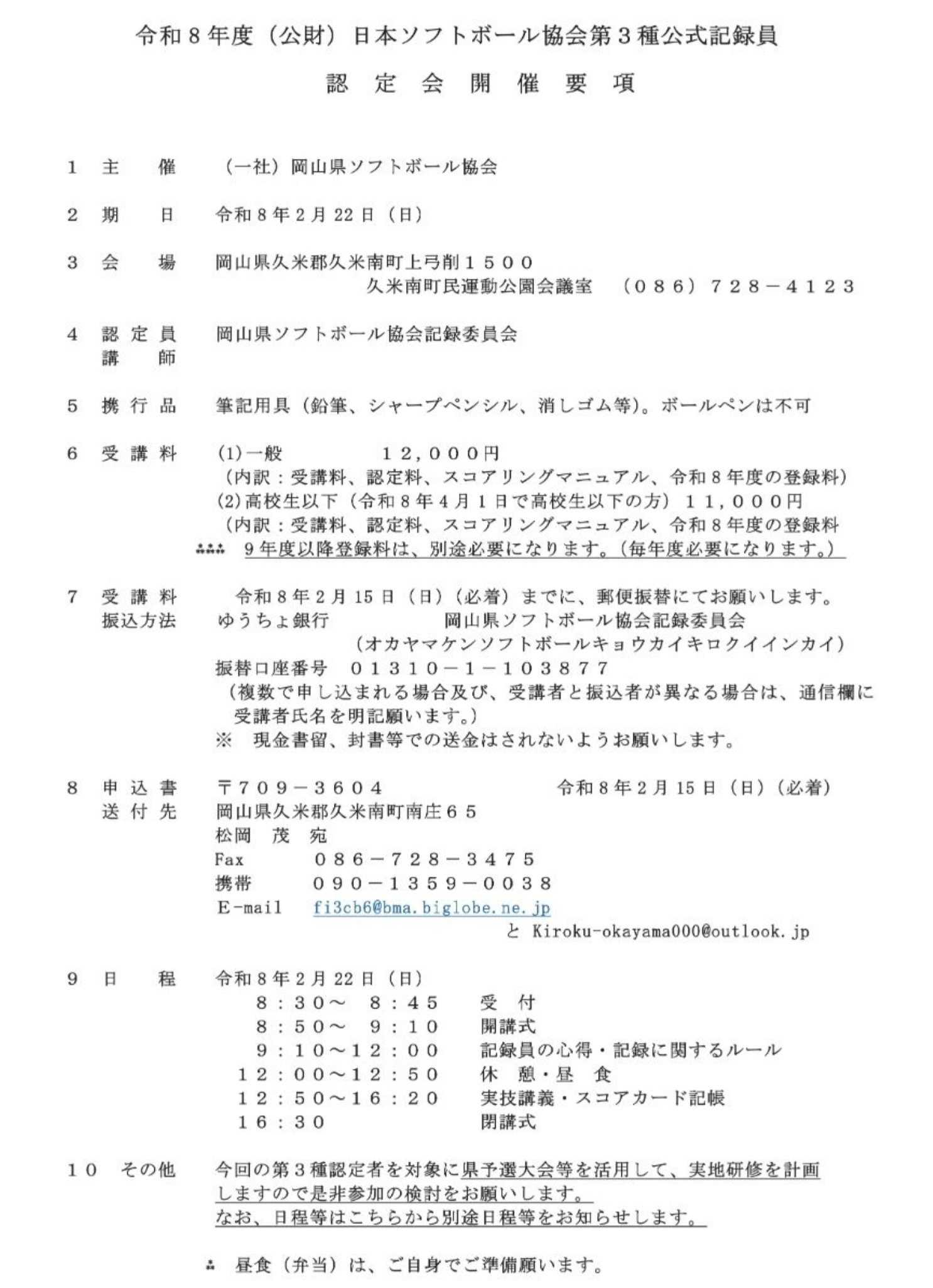 2月22日(日),久米南町民運動公園会議室に於いて,【令和8年度(公財)日本ソフトボール協会第3種公式記録員認定会】を開催します。要項をご覧の上,2月15日(日)[必着]までにお申し込み下さい。開催要項(PDF) 認定会申込書(PDF) 認定会申込書(Excel)