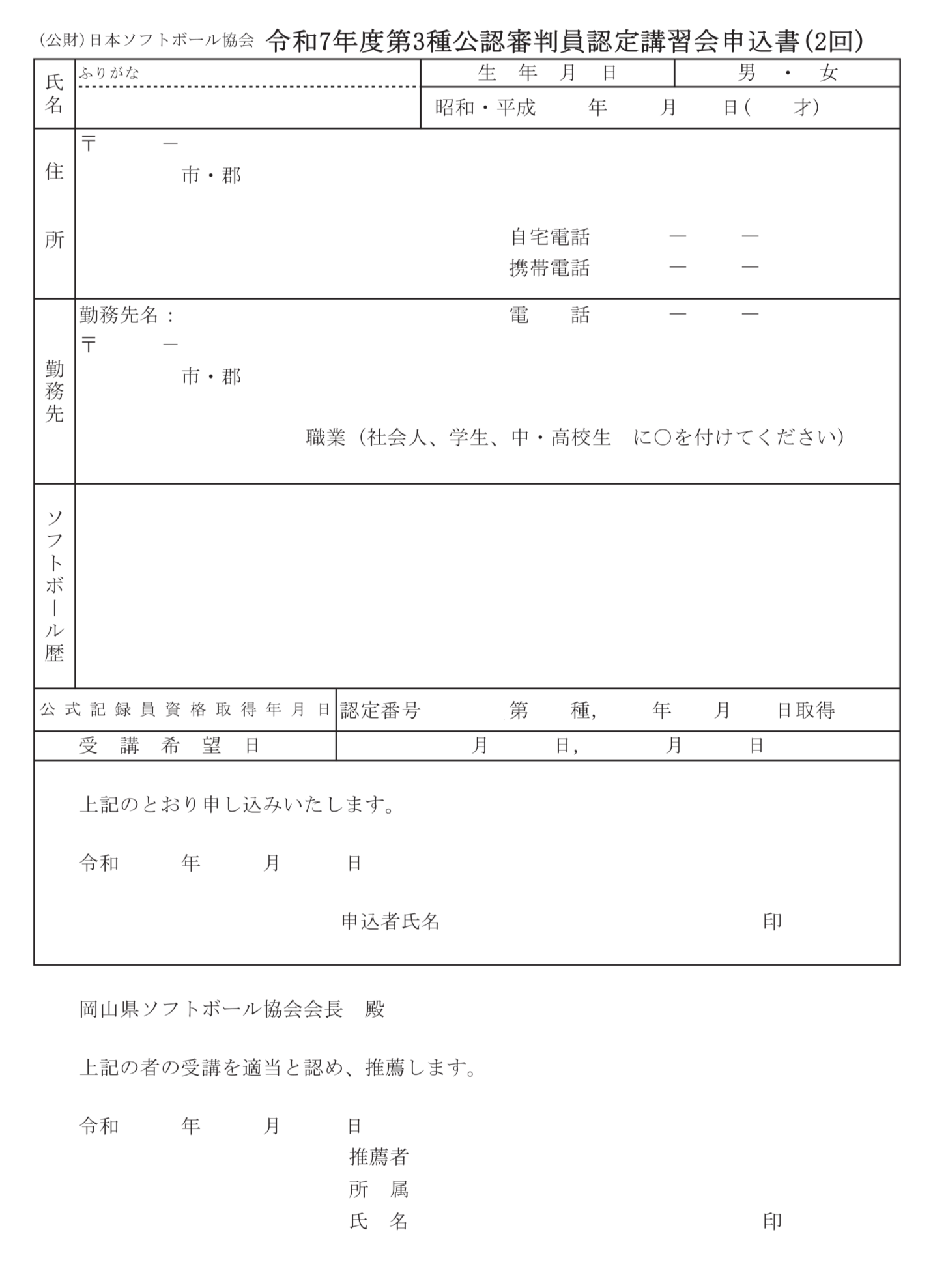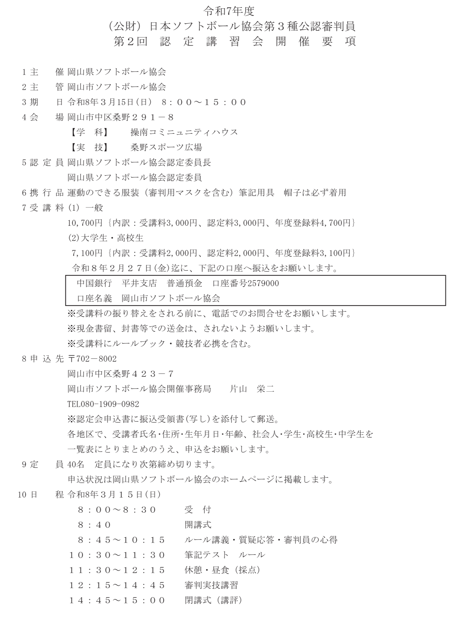 3月15日(日),岡山市操南コミュニティハウス・桑野スポーツ広場に於いて,【令和7年度 (公財)日本ソフトボール協会第3種公認審判員 第2回 認定講習会】を行います。開催要項をお読みの上,締め切り厳守でお申し込み下さい。開催要項(Excel) 開催要項(PDF) 申込書(Excel) 申込書(PDF)